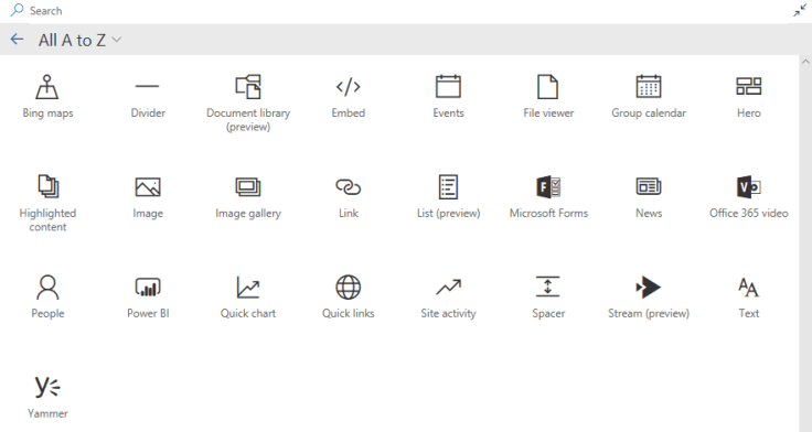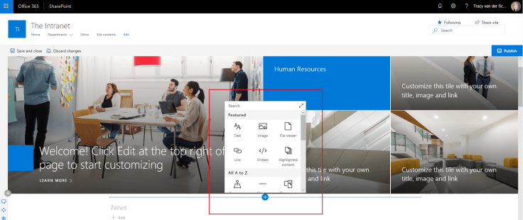 To see the available web parts, put your page in edit mode and click on the “+” in the middle of the page. The easiest way to learn is, of course, to play around with it. I suggest you try out each web part to get a better understanding of what it offers.